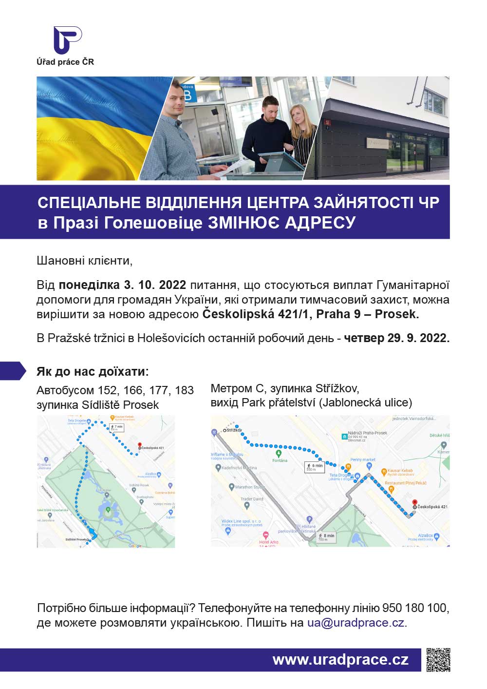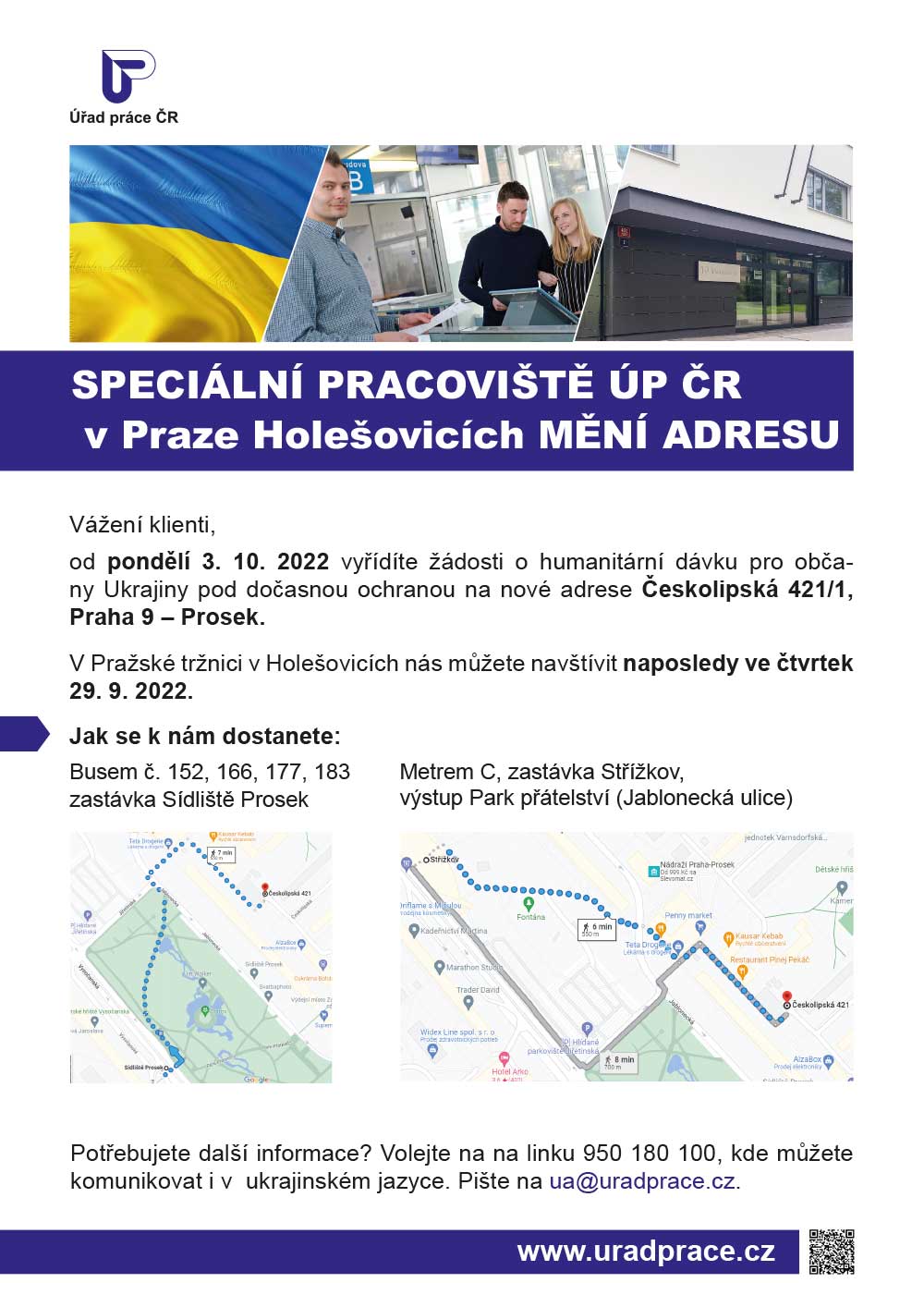 Od pondělí 3. 10. 2022 bude Úřad práce ČR poskytovat v Praze své služby občanům Ukrajiny pod dočasnou ochranou na nové adrese - Českolipská 421/1, Praha 9 – Prosek. Zrekonstruovaná budova ÚP ČR nabídne vyšší komfort nejen klientům, ale také zaměstnancům úřadu. Své záležitosti týkající se humanitární dávky lidé vyřídí v Pražské tržnici v Holešovicích naposledy ve čtvrtek 29. 9. 2022. Od začátku následujícího týdne pro ně bude připraveno 34 přepážek v novém objektu, a to v pondělí a ve středu mezi 8.00 – 17.00 hodinou a v úterý, ve čtvrtek a v pátek mezi 8.00 – 13.00 hodinou.